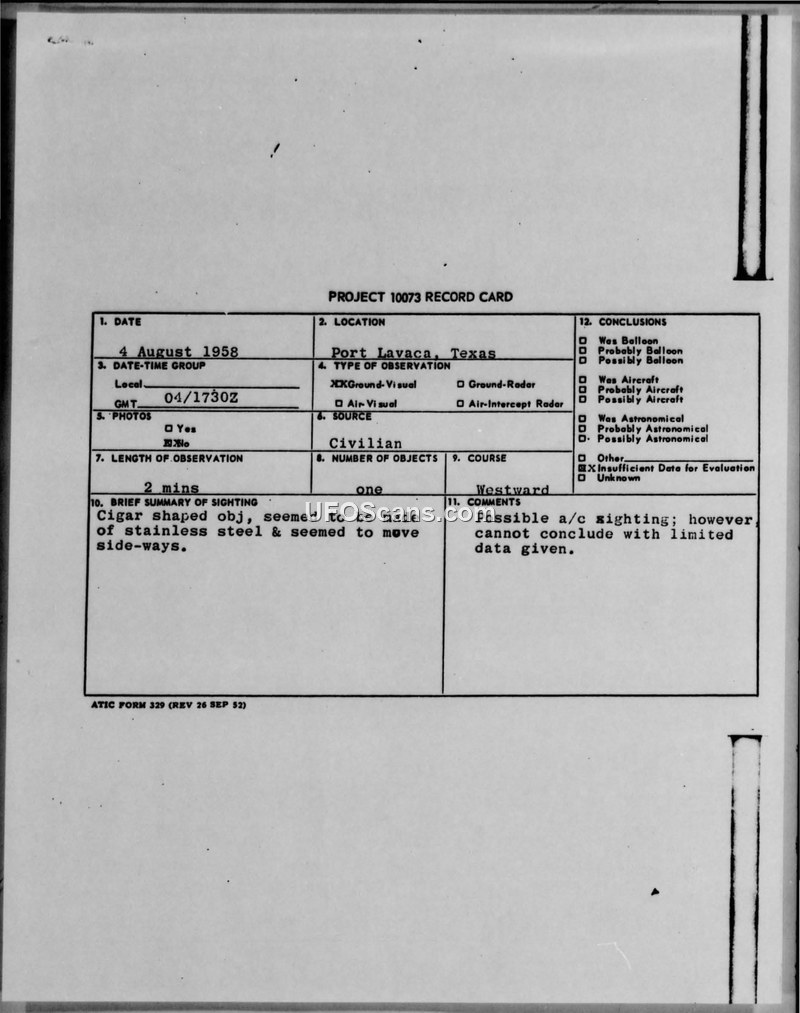 A civilian reported a cigar-shaped, stainless steel object moving westward near Port Lavaca, Texas, on August 4, 1958. Military authorities found no radar confirmation and concluded there was insufficient data to identify the object.