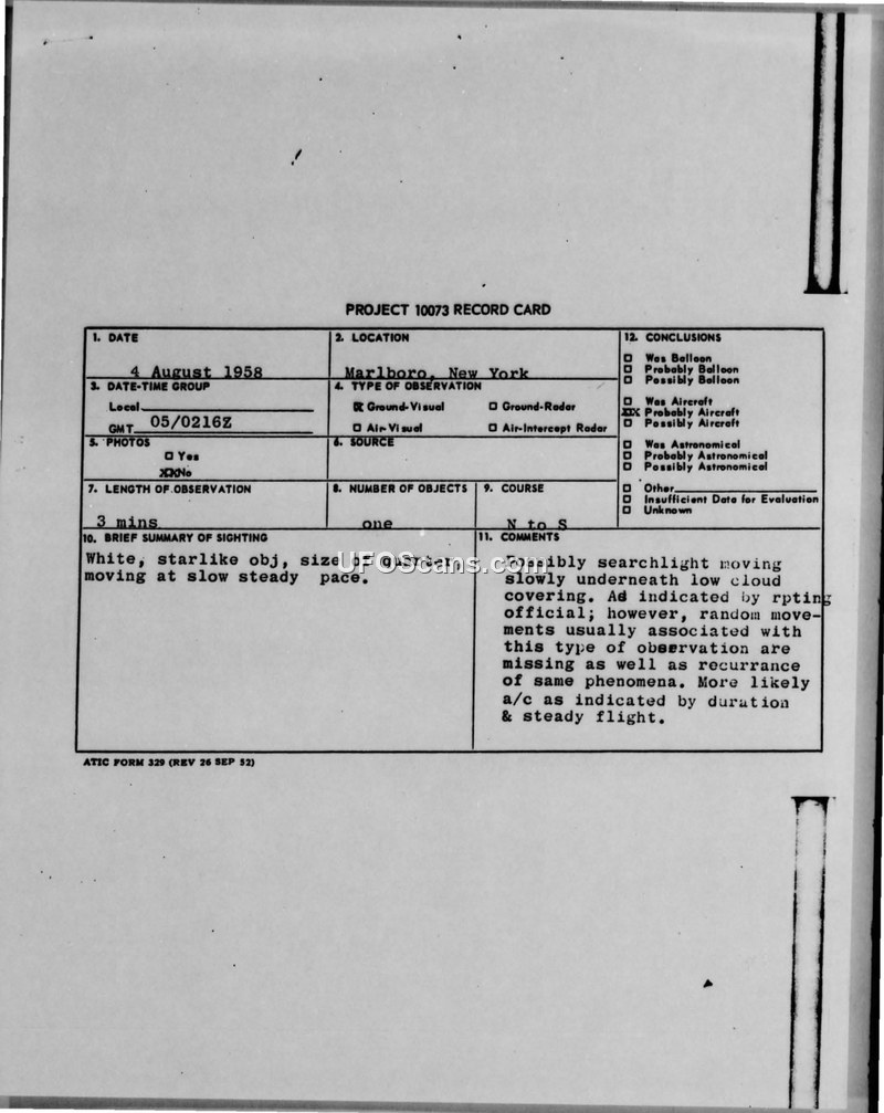 Project 10073 Record Card — Marlboro, New York, 4 August 1958