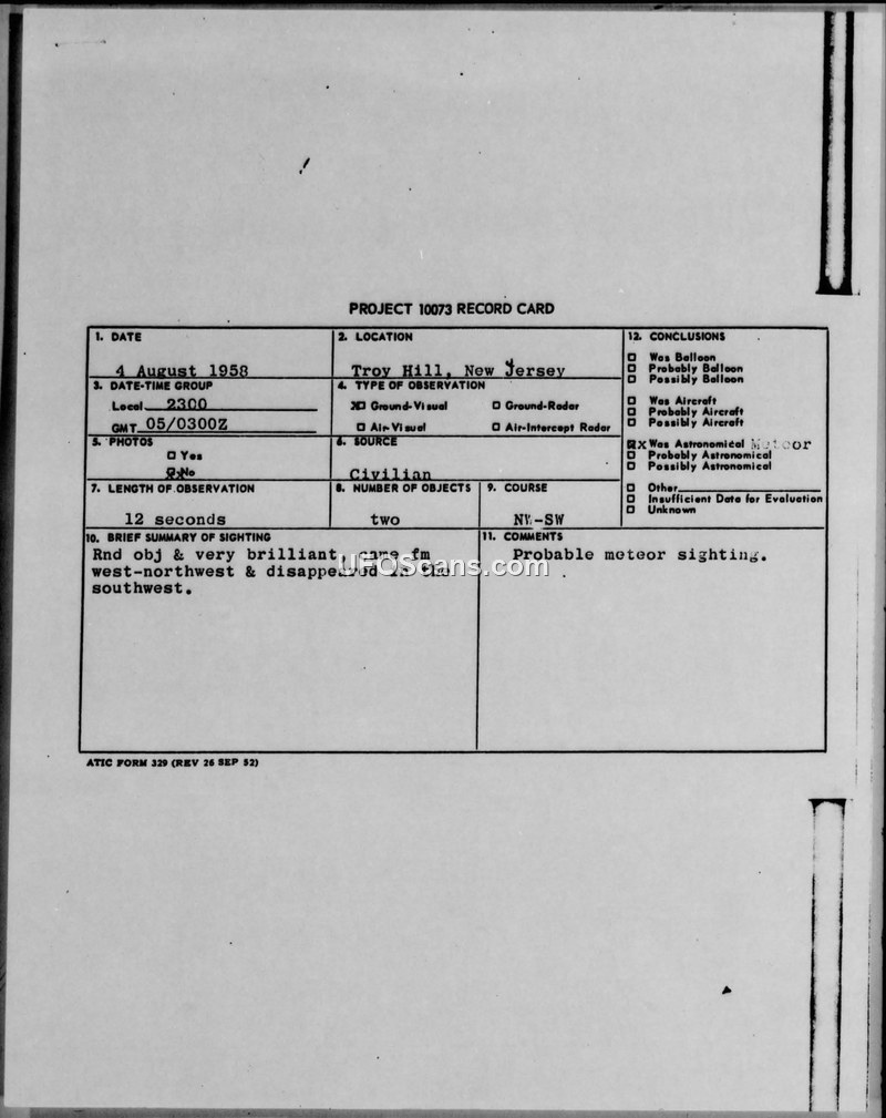 Project 10073 Record Card and OSI Investigation Report — Troy Hill, New Jersey, August 1958