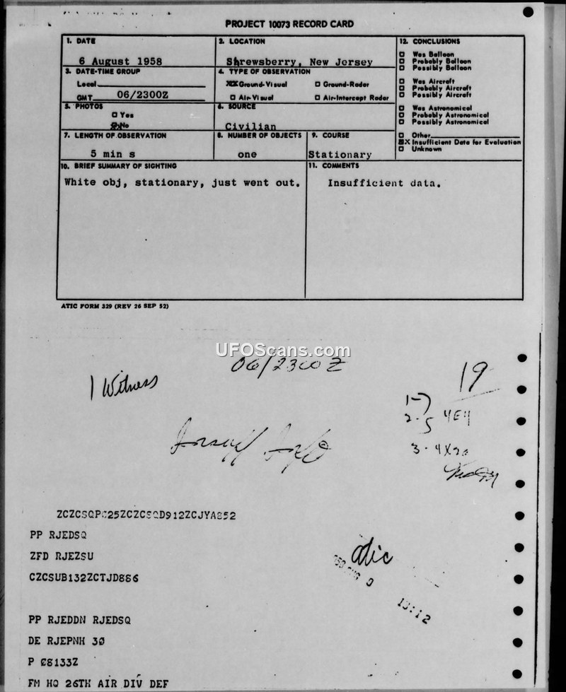 A 1958 sighting report from Shrewsberry, New Jersey, involving a stationary white object observed by an electronics engineer. The military investigation concluded there was insufficient data, with a suggestion it may have been a weather balloon.