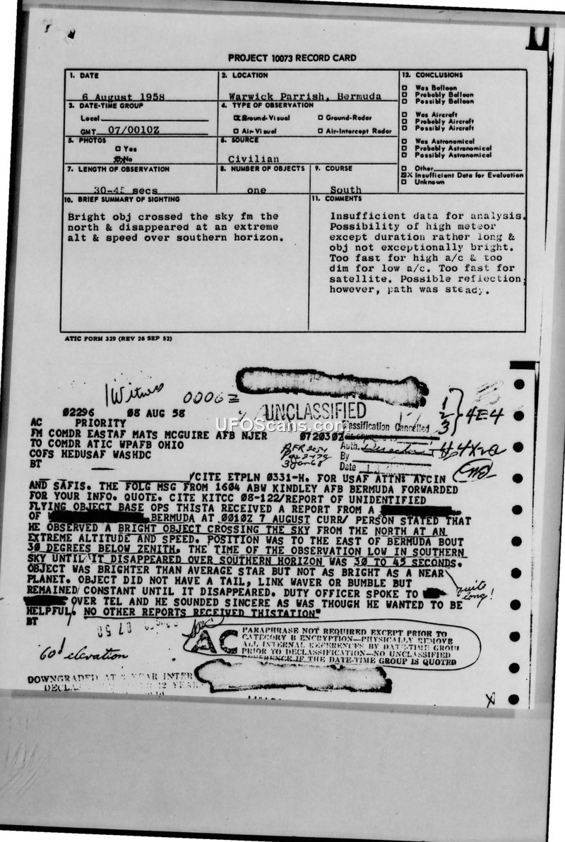 A civilian in Bermuda reported a bright, fast-moving object on August 6, 1958. ATIC evaluated the report and concluded there was insufficient data to identify the object, ruling out conventional aircraft and satellites.