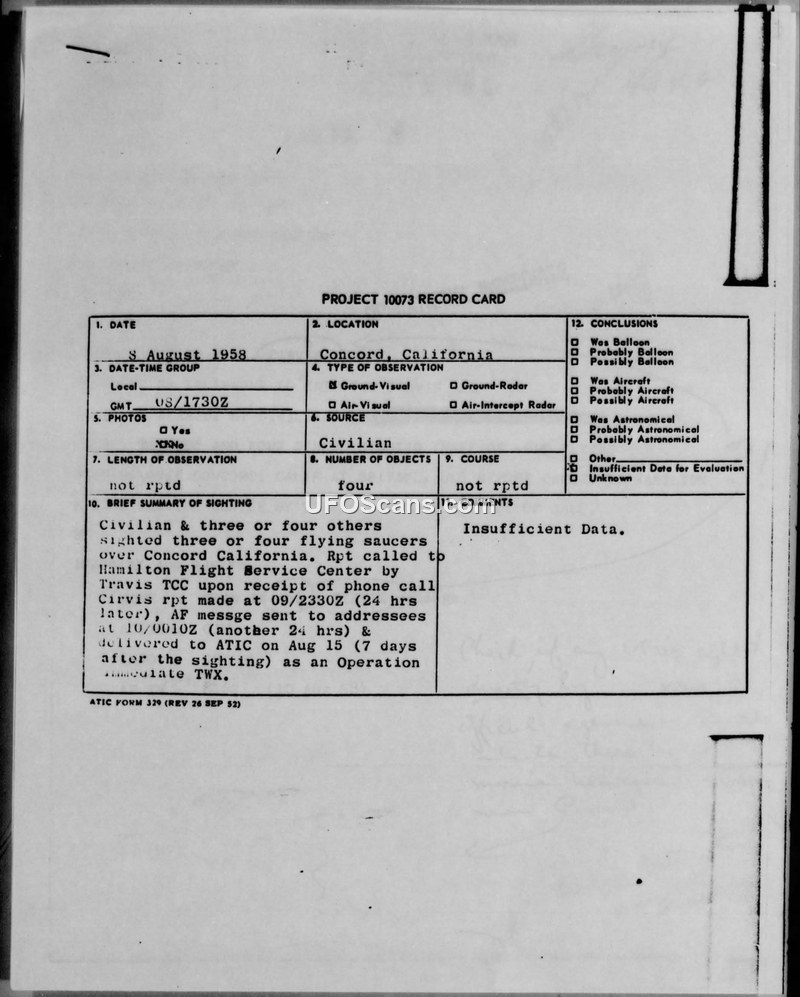 Project 10073 Record Card — Concord, California, 8 August 1958