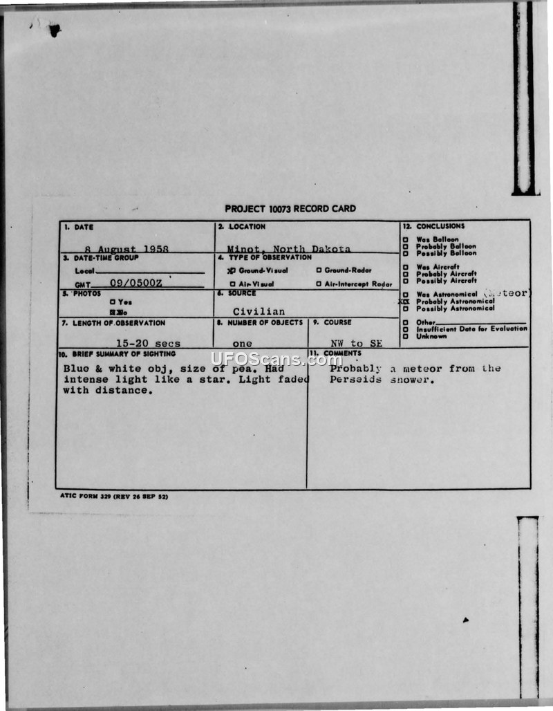A civilian in Minot, North Dakota, reported a blue and white star-like object on August 8, 1958. The military investigation concluded the sighting was likely a meteor from the Perseids shower.