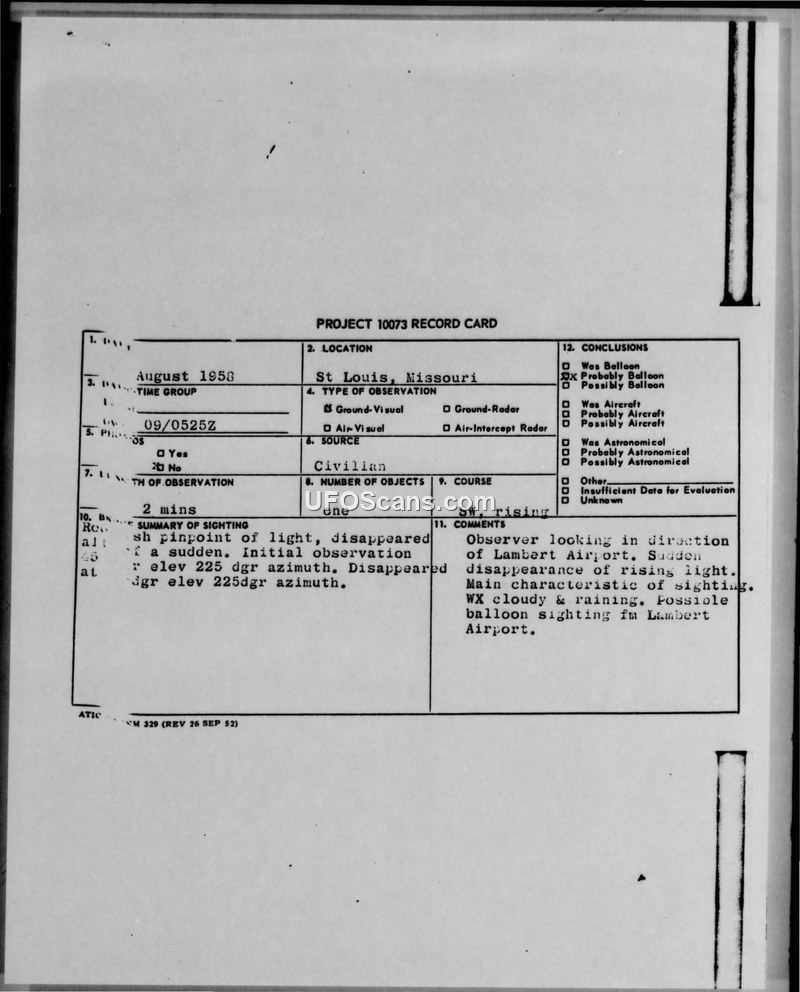 A 1958 sighting report from St. Louis, Missouri, describes a reddish, round, rising light observed by 1/LT Sam Smith. The Air Technical Intelligence Center concluded the object was likely an aircraft or a balloon.
