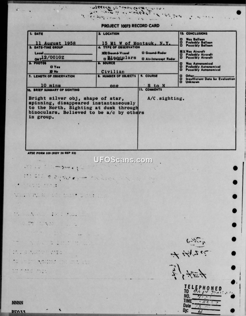 This document consists of a Project 10073 record card and associated teletype communications regarding a UFO sighting that occurred on August 11, 1958, near Montauk, New York. The primary witness, a housewife residing in Amagansett, Long Island, reported observing a bright silver, star-shaped object for approximately ten minutes at dusk. The witness observed the object through binoculars, noting that it was spinning before it disappeared instantaneously to the North. The flight path was recorded as South to North. Despite the duration of the observation, the witness was unable to provide specific estimates regarding the object's size, elevation, or azimuth. The report notes that other individuals in the witness's group believed the object to be an aircraft. The official conclusion reached by the evaluating agency, ATIC, was that the sighting was an aircraft. The investigative notes highlight that the observer was located in a region characterized by high air traffic density and the presence of multiple military installations. The documentation includes weather data indicating clear skies and visibility between 10 to 15 miles at the time of the incident. The report was processed through the 26th Air Division and directed to various Air Force intelligence and command units, including the Air Technical Intelligence Center (ATIC).