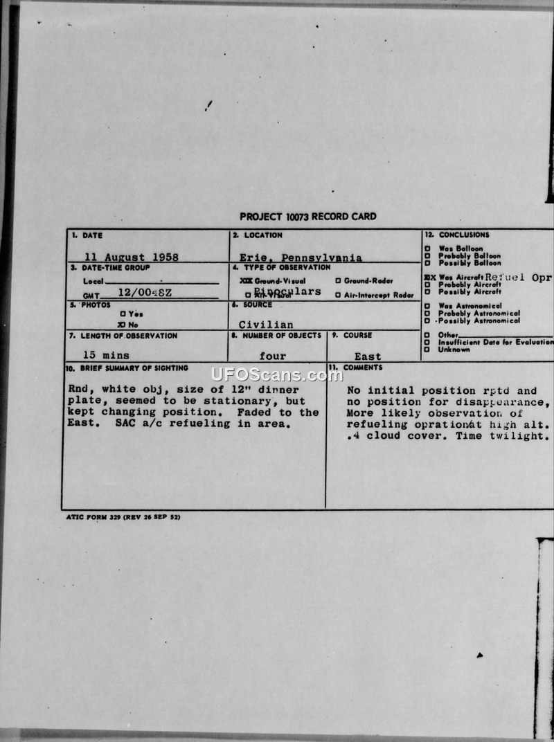 A U.S. Coast Guard observer reported four unidentified objects in Erie, PA, on 11 August 1958. Intelligence officers concluded the sighting was likely a misidentification of SAC aircraft refueling operations.