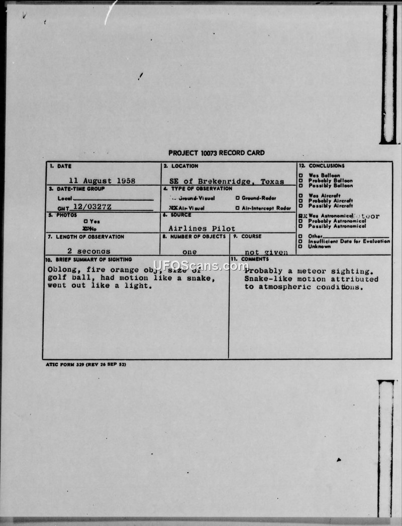 An American Airlines pilot reported a two-second sighting of an oblong, fire-orange object near Breckenridge, Texas, on August 11, 1958. ATIC officials concluded the object was likely a meteor, attributing the observed motion to atmospheric conditions.