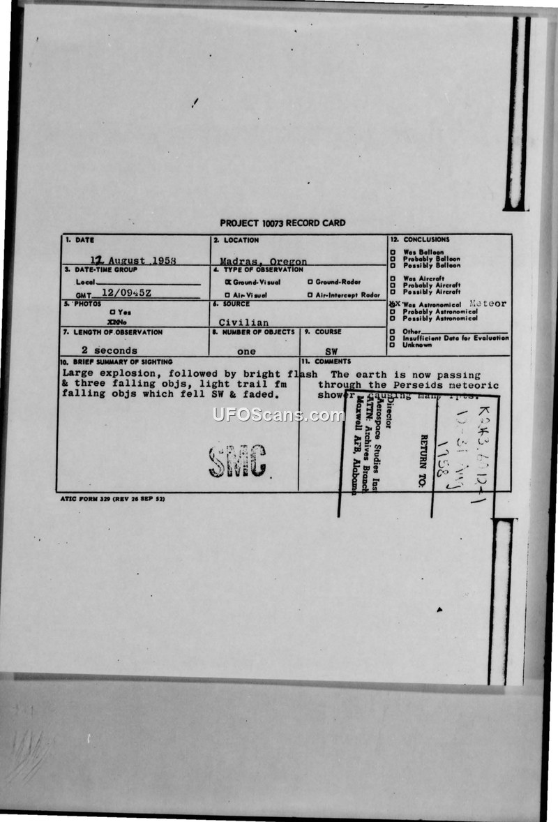 On August 12, 1958, at 0945Z, a sighting occurred in Madras, Oregon, involving a large explosion followed by a bright flash and three falling objects. The event lasted approximately two seconds. The objects were observed to have a light trail and were moving in a southwesterly direction before fading from view. The report was initiated by three civilians whose identities remain unknown; they reported the incident to a Redmond City patrolman, who subsequently notified an ATCS operator at Redmond, Oregon. The official investigation, documented under Project 10073, concluded that the phenomenon was a result of the Earth passing through the Perseids meteor shower, which was noted to be causing many similar reports at the time. The documentation includes a Project 10073 record card and a teletype message from the 192nd AACSRON to various military commands, including the Air Technical Intelligence Center and the Air Defense Command. The report confirms that there were no photographs, radar contacts, or physical traces associated with the event. The weather conditions at the time were reported as clear with 45 miles of visibility. The final assessment by the Air Technical Intelligence Center (ATIC) explicitly links the sighting to the Perseids meteoric shower, suggesting that the observed explosion and falling objects were meteors.
