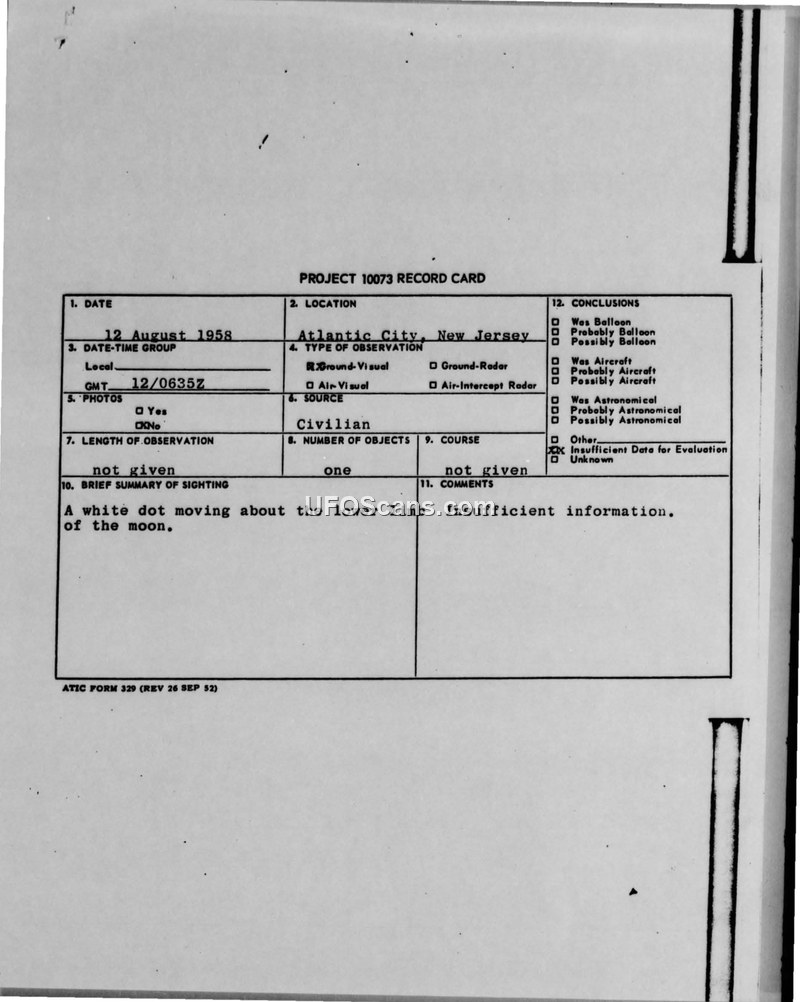 A military witness in Atlantic City reported a white dot moving near the moon on August 12, 1958. The Air Technical Intelligence Center concluded there was insufficient information to evaluate the event.