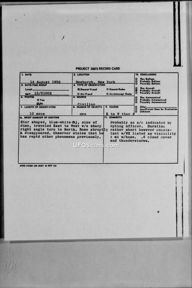 PROJECT 10073 RECORD CARD - 14 August 1958 - Newburgh, New York
