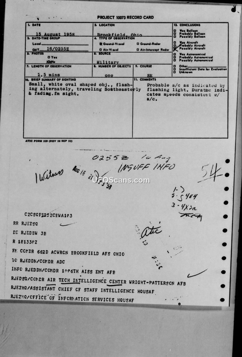 Project 10073 Record Card — Brookfield, Ohio, 15 August 1958
