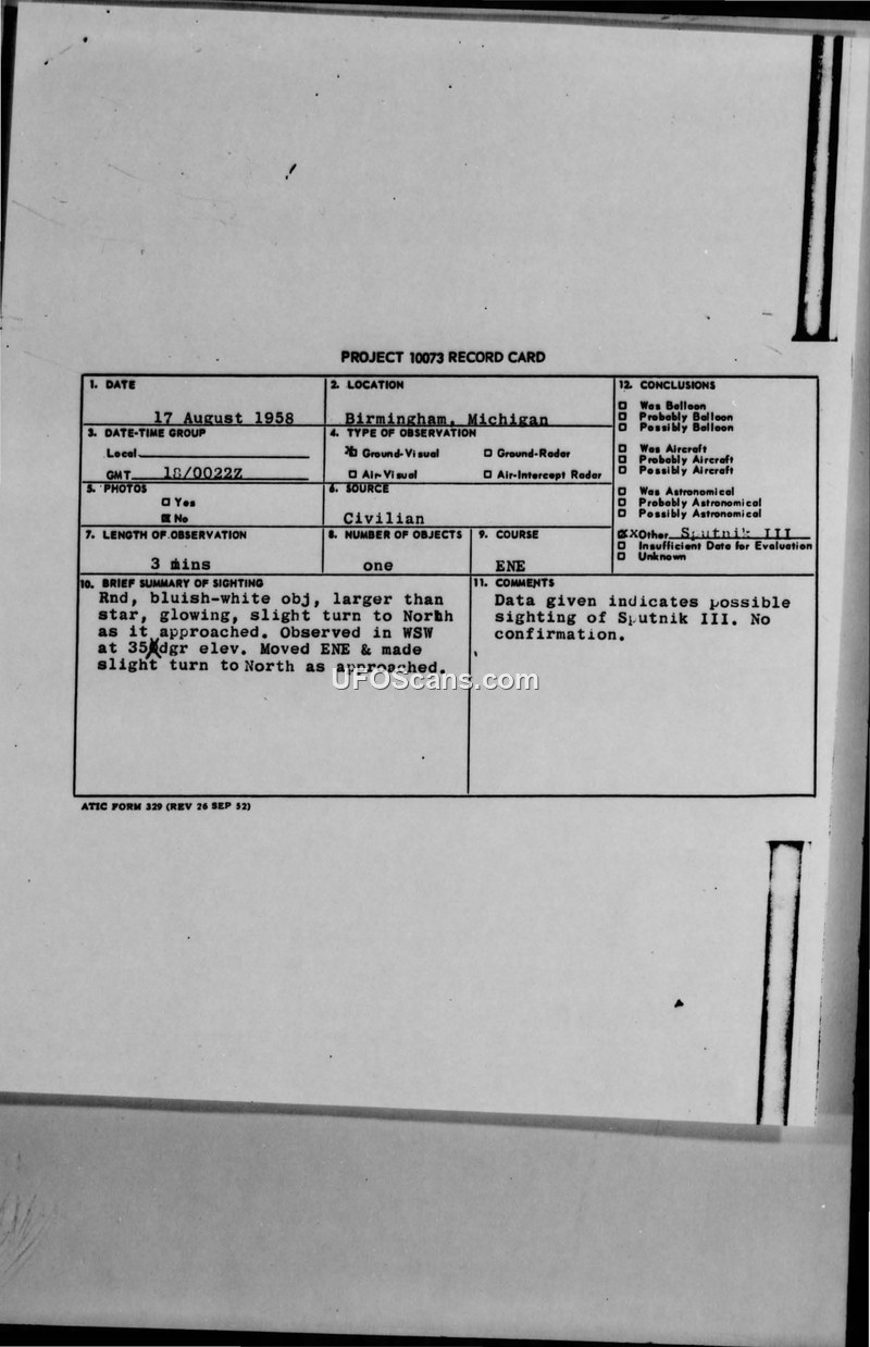 A civilian sighting of a glowing object in Birmingham, Michigan, on August 17, 1958, was investigated by the Air Force. While initially suspected to be Sputnik III, subsequent analysis suggested the object was likely the planet Jupiter.