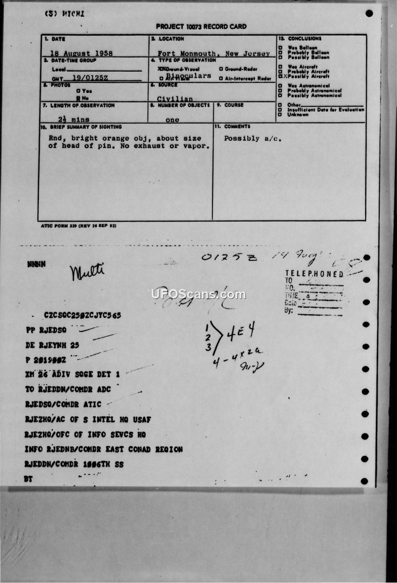 A 1958 sighting of a bright orange, round object at Fort Monmouth, New Jersey, was officially concluded to be a possible aircraft exhaust glow. The report was processed under Project 10073.