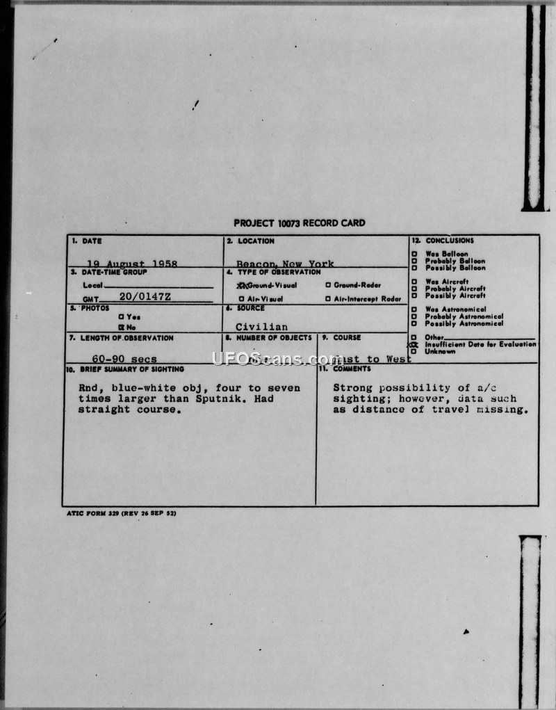 A 1958 sighting report from Beacon, New York, describes a large, round, blue-white object observed by four people. Military intelligence concluded it was possibly an aircraft but lacked sufficient data for a definitive identification.