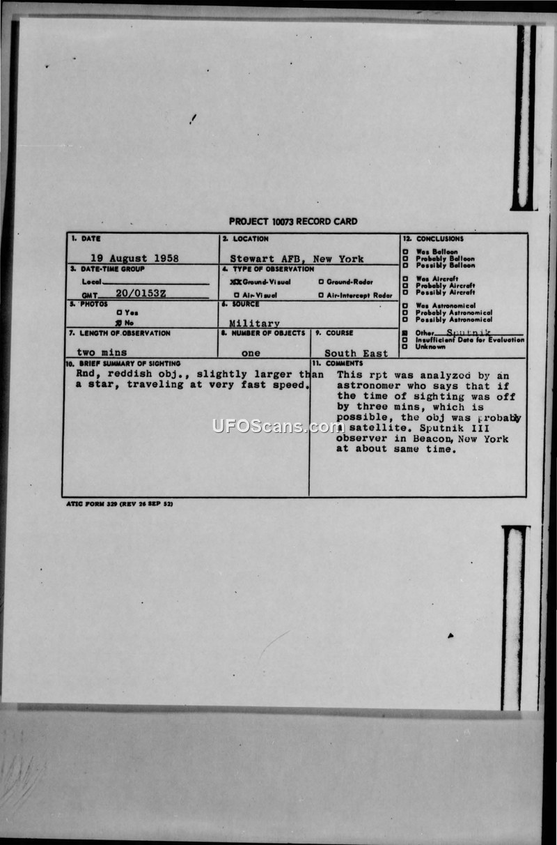Project 10073 Record Card — Stewart AFB, New York, 19 August 1958