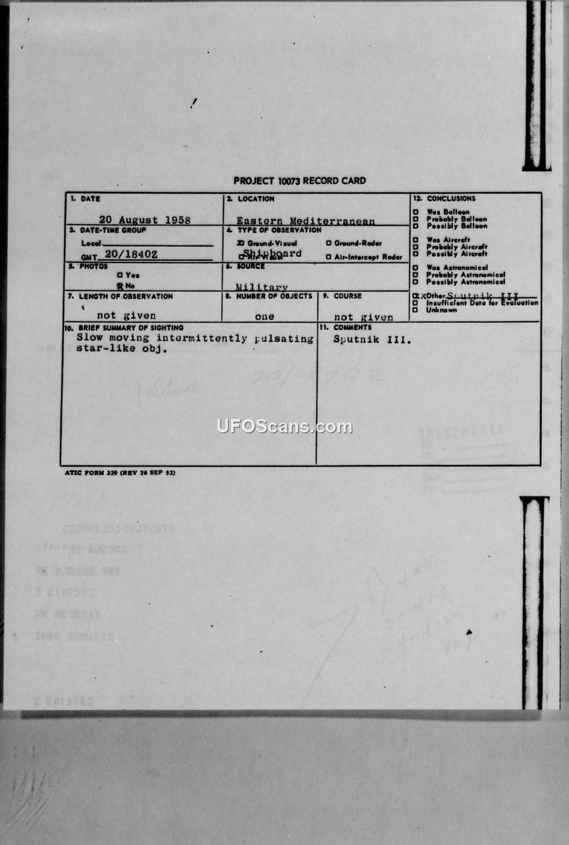Project 10073 Record Card — Eastern Mediterranean, 20 August 1958