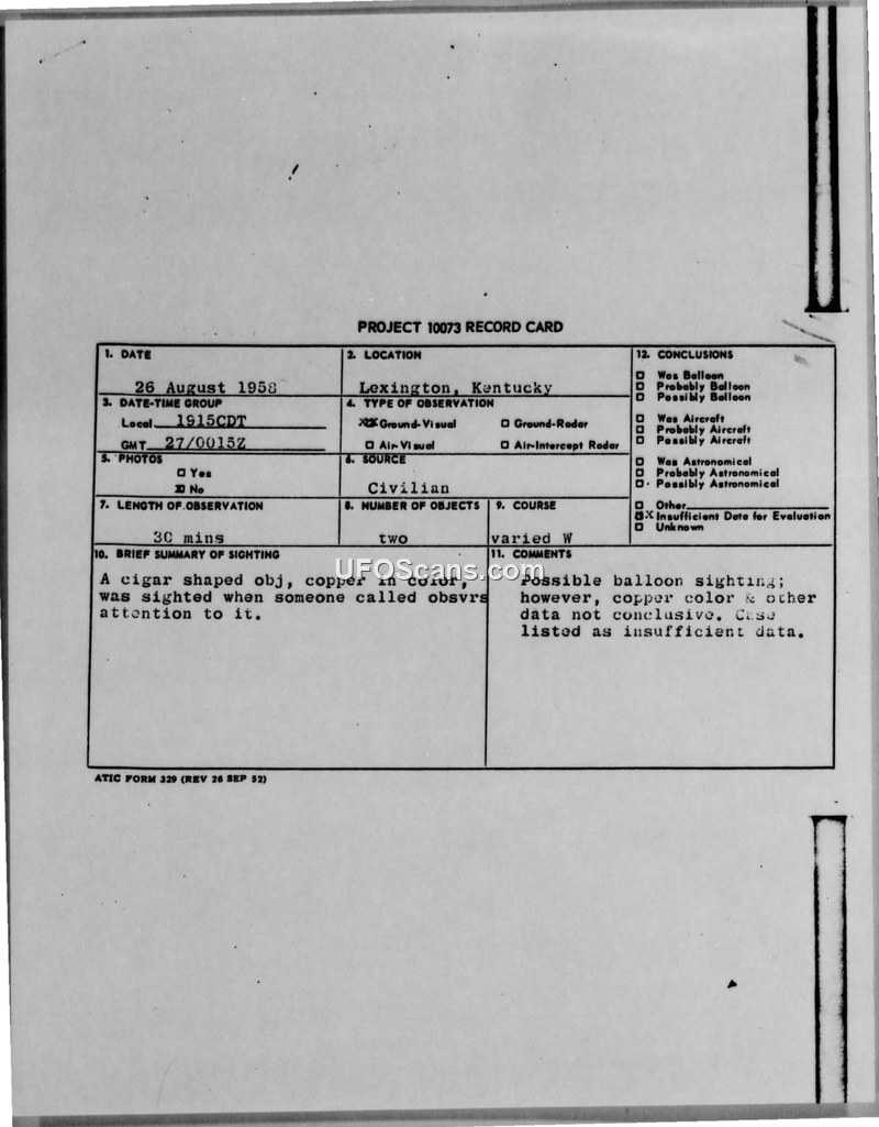 A civilian witness reported two cigar-shaped, copper-colored objects over Lexington, Kentucky, on August 26, 1958. The Air Force investigation concluded the case had insufficient data due to inconsistencies in the witness's report.