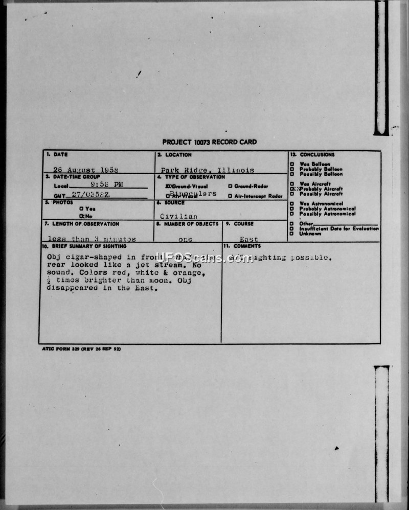 A civilian engineer reported a cigar-shaped, multi-colored aerial object in Tinley Park, Illinois, on August 26, 1958. Military officials concluded the sighting was likely a jet aircraft with afterburners.
