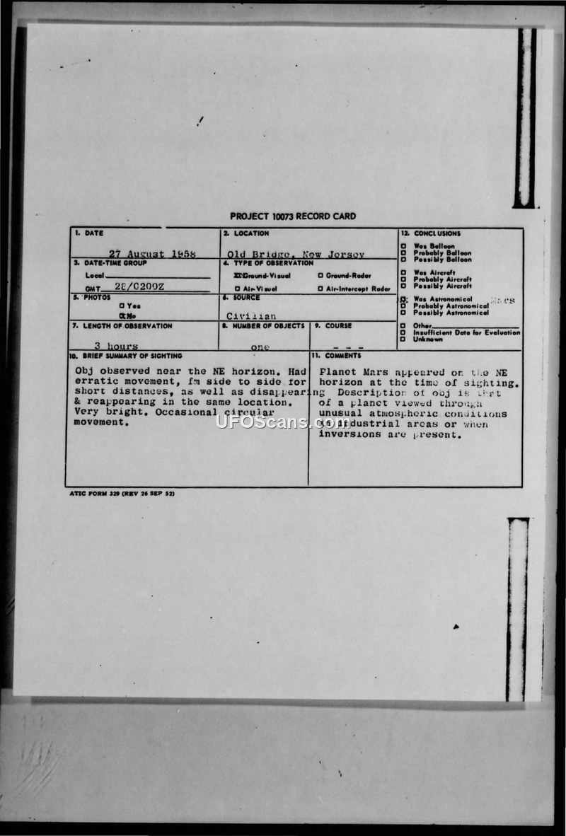 This document consists of a Project 10073 record card and associated correspondence regarding a UFO sighting reported by civilians in Old Bridge, New Jersey, on August 27, 1958. The witnesses reported observing a very bright object near the northeastern horizon for approximately three hours. They described the object as exhibiting erratic side-to-side movement over short distances, disappearing and reappearing in the same location, and occasionally moving in a complete circle. The witnesses contacted the Technical Intelligence Branch at Wright-Patterson Air Force Base to inquire about the nature of the object. The Air Force investigation, conducted by Colonel H. K. Gildert and Major Lawrence J. Tacker, concluded that the sighting was likely an astronomical phenomenon. The official assessment suggested that the observers were viewing either the planet Mars or the star Alpheratz, both of which were positioned in the northeastern sky at the time of the report. The investigators attributed the perceived erratic movement and the object's behavior to unusual atmospheric conditions, specifically noting that industrial haze or exhaust fumes, combined with temperature inversions, can cause celestial bodies to appear to move or behave in an unconventional manner. The final correspondence from Major Tacker to the witnesses formally acknowledged their report and provided this astronomical explanation as the likely cause of their observation.