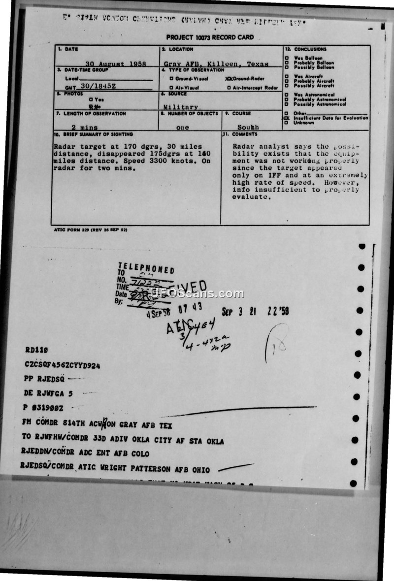 Project 10073 Record Card: Gray AFB, Killeen, Texas, 30 August 1958