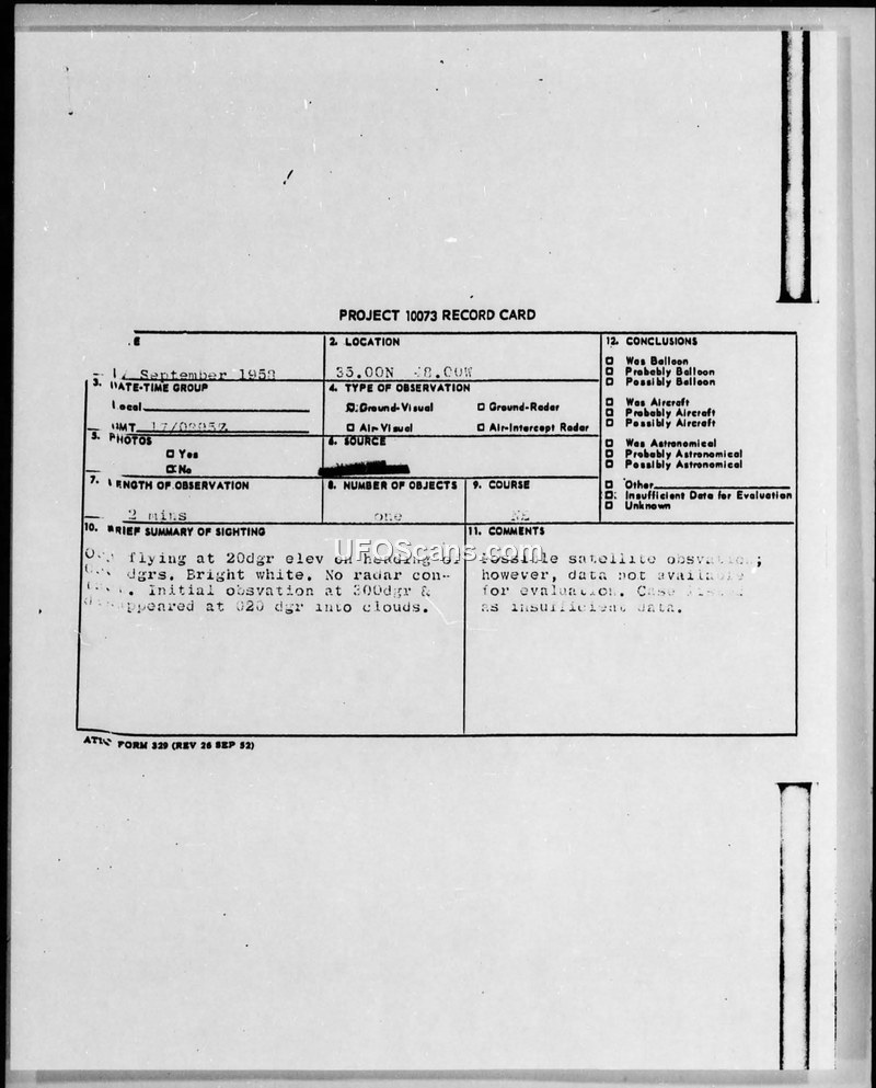 This document consists of a Project 10073 record card and a series of incoming military messages regarding an unidentified aerial phenomenon observed on September 17, 1958. At 0854Z, an object was sighted at coordinates 35.00N 48.00W. The object was described by four witnesses as a bright white light. It was observed for approximately two minutes, during which it maintained a constant position angle while moving from a heading of 050 degrees across the northern sky to 020 degrees, eventually disappearing into clouds. Military authorities confirmed that there was no radar contact associated with the sighting. Multiple communications were exchanged between various commands, including the Air Defense Command, CINCLANTFLT, and COMASDEFORLANT, to amplify the details of the report. The final evaluation recorded on the project card suggests the phenomenon was a possible satellite observation, but ultimately concluded that there was insufficient data available for a definitive identification. Consequently, the case was closed.