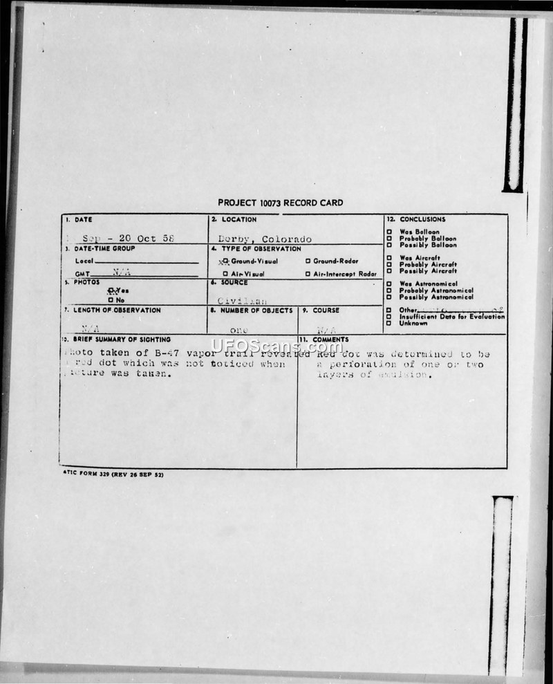 Project 10073 Record Card — Derby, Colorado, 1958