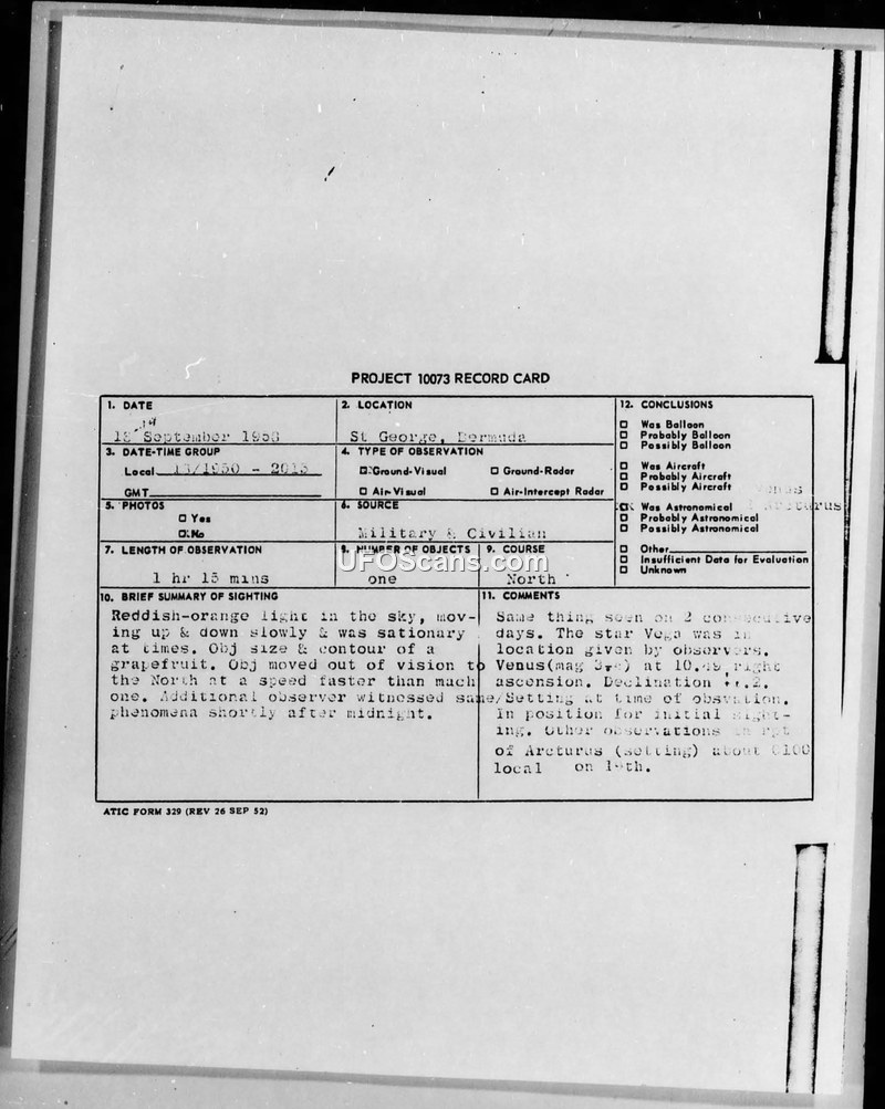 Project 10073 Record Card — St. George, Bermuda, September 1958