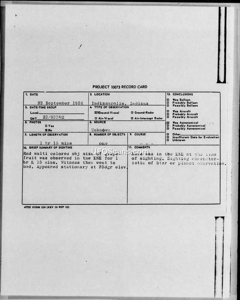 A sighting of a stationary, multi-colored object in Indianapolis on September 22, 1958, was investigated by ATIC. The object was officially identified as the planet Mars.