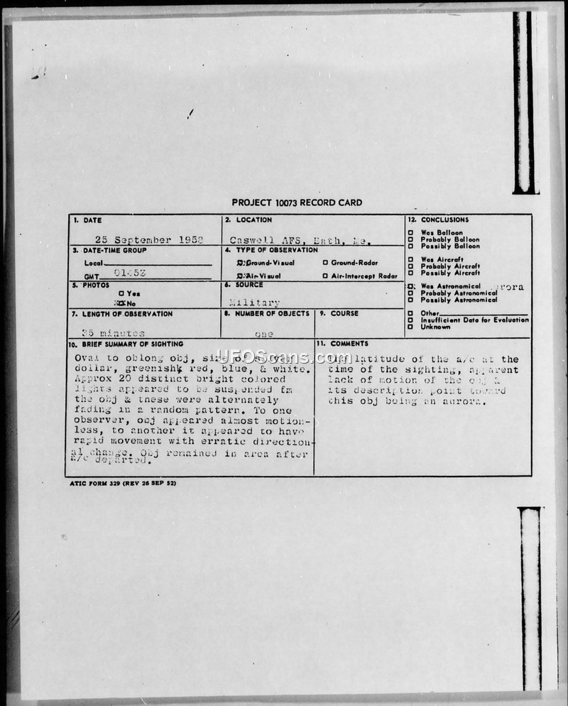 This document is a collection of records and correspondence regarding a UFO sighting that occurred on September 25, 1952, near Caswell AFS, Maine. A B-52 aircraft, identified as tail number 678, was requested by the controller at Caswell AFS to investigate an unidentified object. The object was described by the crew as an oval to oblong shape, roughly the size of a silver dollar, displaying greenish-red, blue, and white colors. Approximately 20 distinct bright lights appeared to be suspended from the object, which were observed fading in a random pattern. The crew reported that the object appeared almost motionless to one observer, while another reported rapid, erratic movement. The object remained in the area for 35 minutes after the aircraft departed. Ground radar at the AC&W site was unable to detect the object. The weather conditions included haze and a slight aurora borealis. The crew, which included 1st Lt. Frank C. Knaack and T/Sgt. Floyd G. Tatem, were experienced in high-altitude night flying and familiar with aurora effects. They noted the planet Saturn at approximately 5 degrees elevation above the object. Following the sighting, the aircraft's search radar and interphone system experienced electronic failures, which were investigated by the A&E shop. The official conclusion reached by the Air Technical Intelligence Center (ATIC) was that the sighting was likely an aurora, citing the latitude of the aircraft and the description of the object. The report also notes that a local radio station, WEB-Boston, carried a report of a UFO sighting by a civilian in Southwick, Massachusetts, on the same date, which was being investigated.