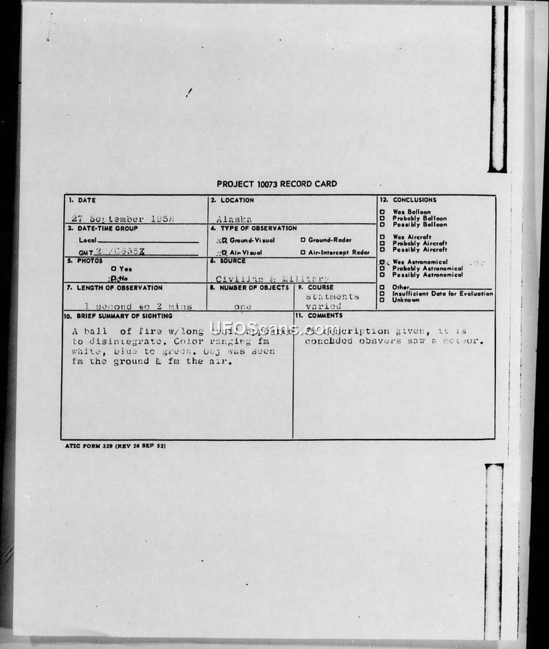This document collection details a series of UFO sightings reported over Alaska on September 27, 1958. The reports, consolidated under Project 10073, describe a round, glowing object with a long trail that appeared to disintegrate. Witnesses, including civilian and military personnel, described the object's colors as ranging from white to blue and green. One witness compared the object's size to that of a full moon. The object was observed from both the ground and the air, with reports indicating it moved in various directions, including south, northeast, and west to east. Despite the variety of flight paths reported, the consensus among observers was that the object left a long trail and, in several instances, appeared to emit sparks or flames. The duration of the sightings ranged from one second to two minutes, and no sound was reported. The Air Technical Intelligence Center (ATIC) requested that the 10th Air Division (Defense) coordinate with the University of Alaska to determine if a large meteor had entered the Earth's atmosphere. Subsequent correspondence from the 10th Air Division (Defense) confirmed that the University of Alaska had no information regarding any natural phenomena occurring at the time of the sightings. The official conclusion recorded on the Project 10073 record card is that the observers saw a meteor, though internal intelligence assessments also noted the possibility of a meteorite or the reentry of an Earth Satellite Vehicle (ESV).
