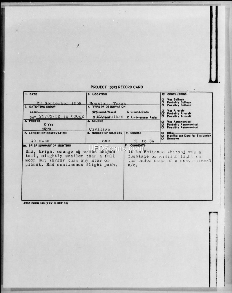 Report of Unidentified Flying Object — Houston, Texas, 29 September 1958