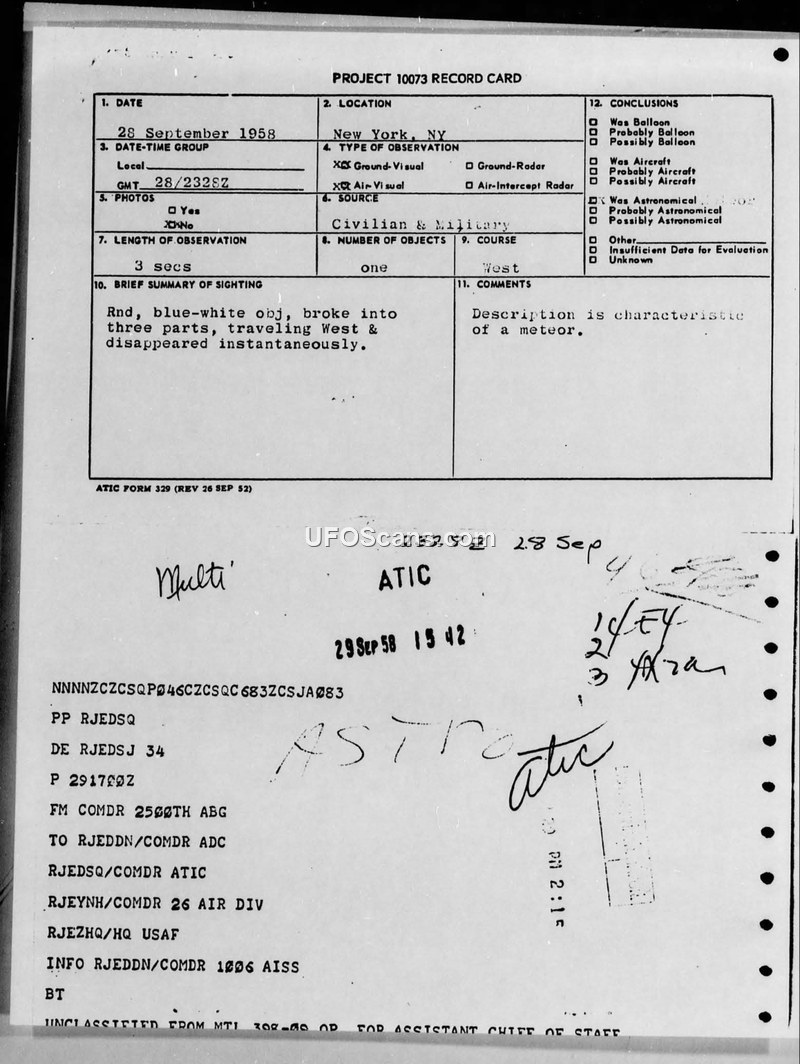 Project 10073 Record Card — New York, NY, 28 September 1958