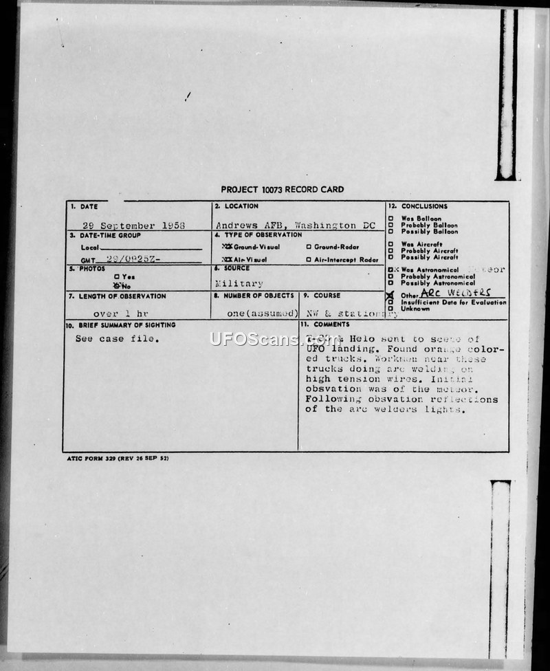 A 1958 UFO sighting near Andrews AFB was investigated by the Air Force and identified as reflections from arc-welding equipment used by construction crews. The report includes official military correspondence and a subsequent newspaper article confirming the mundane explanation.