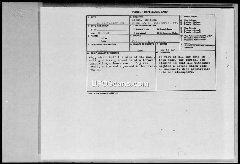 This document archive details a series of reports concerning an unidentified aerial phenomenon observed on the morning of September 29, 1958. The primary incident involved a sighting in Milan, Indiana, where witnesses described a round, white object, approximately half the size of the moon, emitting a whirring sound similar to a baseball with a loose cover. The object was observed moving from the southeast to the northwest and appeared to be breaking up. Similar reports were received from witnesses in Washington, D.C., and as far west as Pittsburgh, Pennsylvania. The Air Technical Intelligence Center (ATIC) conducted an investigation into these reports. The official conclusion reached by the Air Force was that the witnesses had observed a meteor that made an unusually deep penetration into the Earth's atmosphere. The observatory at Georgetown University also received reports of the object and concluded it was a meteor. The ATIC noted that the consistency of the reports across a wide geographic area, combined with the description of the object's appearance and sound, supported the meteor hypothesis. Some witnesses reported seeing the object break into multiple pieces, which investigators attributed to the breakup or burnout of the meteor. The document includes various record cards, correspondence from witnesses, and internal Air Force memos, including a cover sheet from the 2253D Air Base Group. The investigation also addressed and discounted other possibilities, such as aircraft or errant missiles. A light seen on the ground near Washington, D.C., was determined to be a floodlight on a barn. The archive also contains subsequent correspondence from 1960 and 1961, where individuals who had reported sightings in 1958 requested information on the findings of their reports, to which the Air Force responded by confirming the meteor conclusion.
