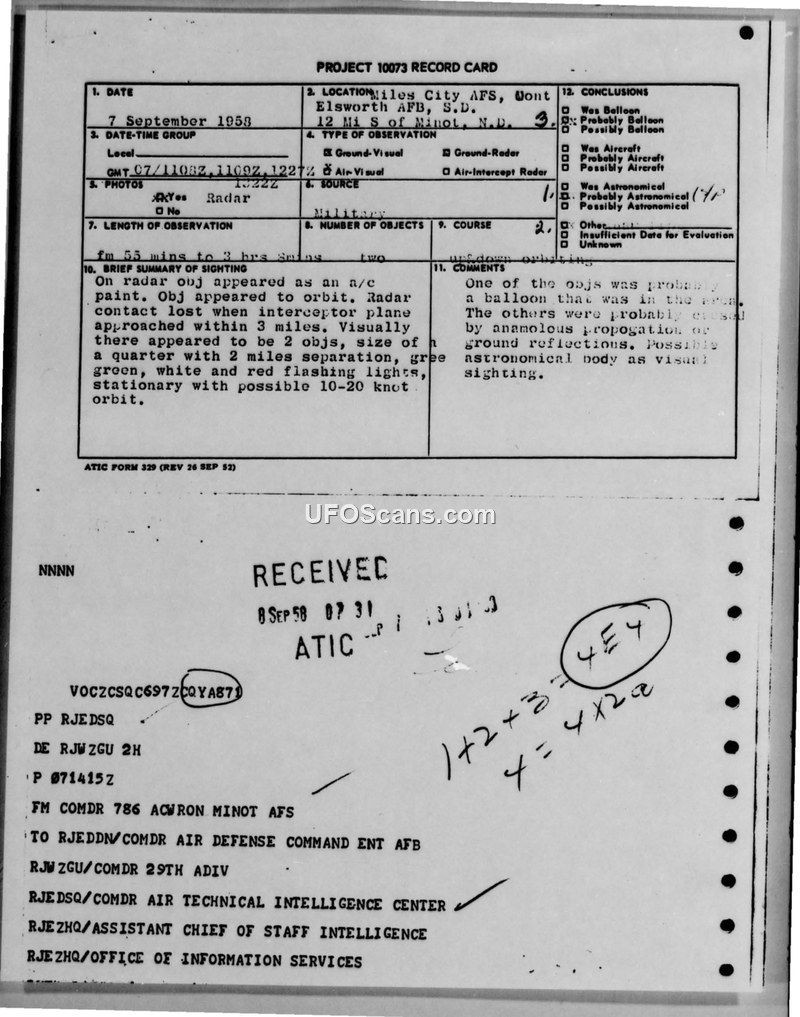This document collection details a series of radar and visual sightings of unidentified aerial phenomena occurring on September 7, 1958, across multiple radar sites in Montana and South Dakota, including Miles City AFS and Ellsworth AFB. The reports describe radar contacts that appeared to orbit in a relatively small area, with some visual observations noting two objects with green, white, and red flashing lights, appearing the size of a quarter. Intercept attempts were made by military aircraft, but pilots were unable to confirm the objects visually, despite radar contact being maintained by ground stations. The objects were observed to climb and move in circular flight paths, with altitudes ranging from 10,800 to 20,000 feet. The duration of the sightings spanned over three hours. Thirteen photographs of the electronic radar displays were taken, though no physical evidence was recovered. An official evaluation by AFCIN-4E1 concluded that the sightings were likely caused by the same phenomenon, suggesting possibilities such as weather balloons or anomalous propagation and ground reflections. The documentation includes project record cards, teletype messages between military units, and a formal disposition form evaluating the reports.