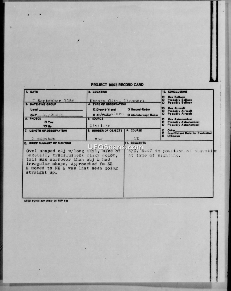 This document collection consists of Project 10073 record cards and associated Air Force staff messages regarding multiple UFO sightings reported in the vicinity of Kansas City, Missouri, in September 1958. The reports detail observations made by civilians, including a student from the University of Kansas and a housewife. Witnesses described an oval-shaped object, sometimes appearing with a long tail, which was translucent, milky, or bright yellow in color. The object was reported to perform maneuvers such as sharp turns, reversing course, and moving straight up. The duration of these sightings ranged from three to five minutes. Military authorities, including the 20th NORAD Division and the Air Technical Intelligence Center (ATIC), investigated these reports. Despite the observers' claims, including one witness who had four years of experience as a weather observer in the USAF and explicitly stated the object was not a B-47, the official conclusion reached by the Air Force was that the sightings were a misinterpretation of conventional aircraft. Specifically, investigators noted that a B-47 was in the area at the time of the sightings and suggested that the high-altitude nature of the flight made identification difficult for the observers. The documents include technical data such as weather conditions, flight paths, and coordinates, alongside internal correspondence and record cards summarizing the incidents.