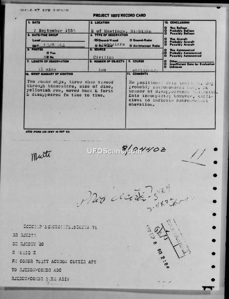 A civilian reported two yellowish-red objects near Hastings, Michigan, on 7 September 1953. The military investigation concluded the sighting was likely an astronomical observation, possibly a star magnified by binoculars.
