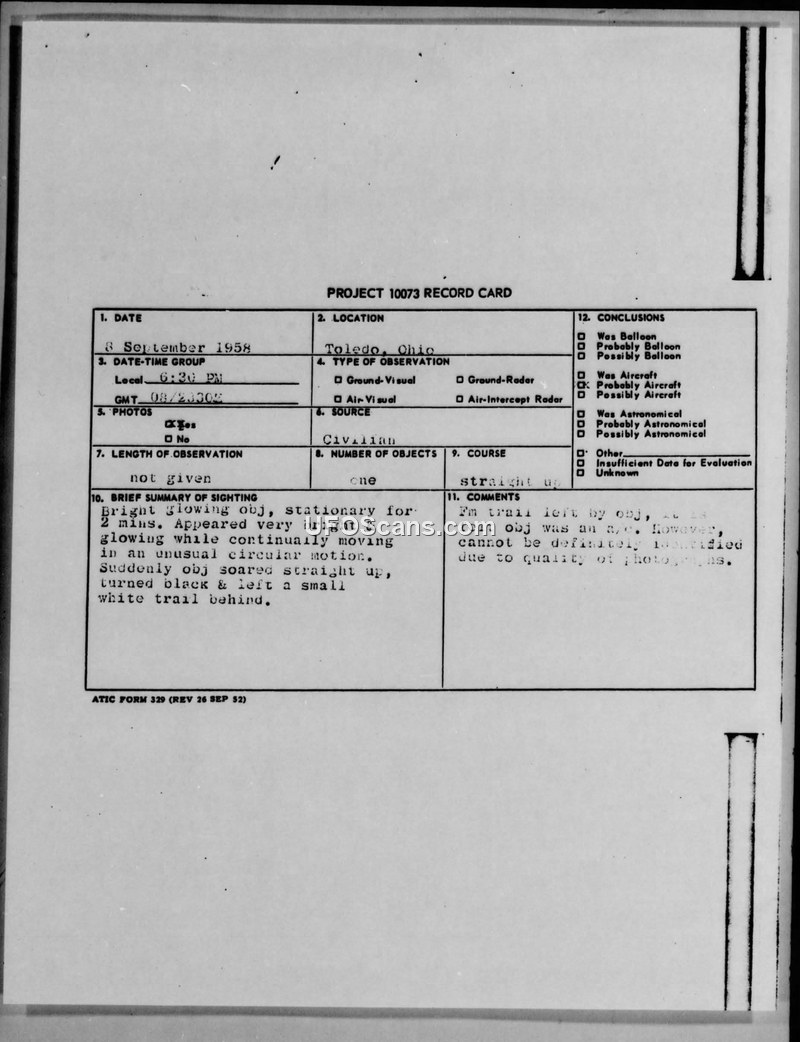 Project 10073 Record Card and Correspondence — Toledo, Ohio, 8 September 1958