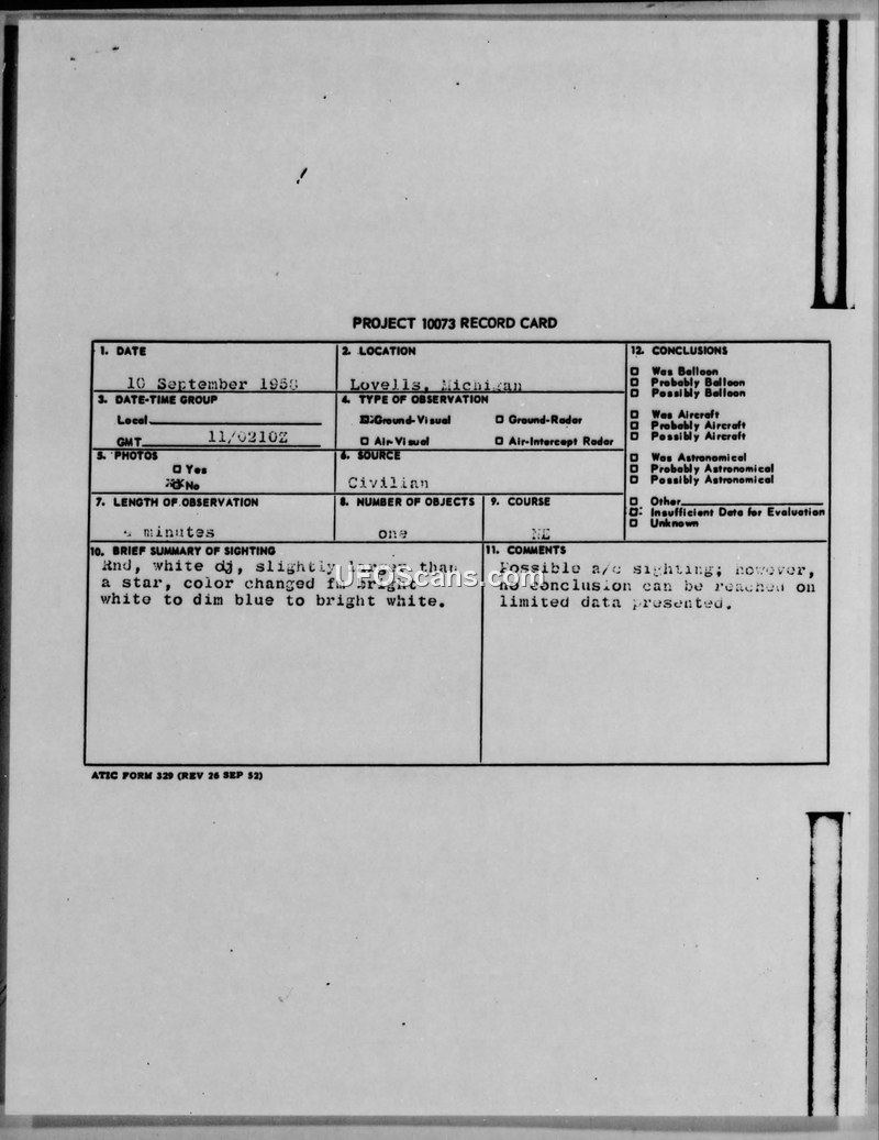 PROJECT 10073 RECORD CARD — Lovells, Michigan, 10 September 1958