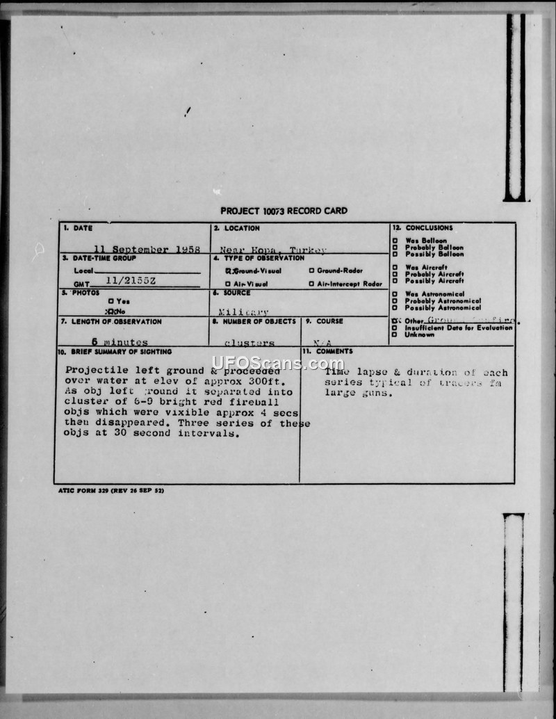 Project 10073 Record Card: Sighting Near Hopa, Turkey, 11 September 1958