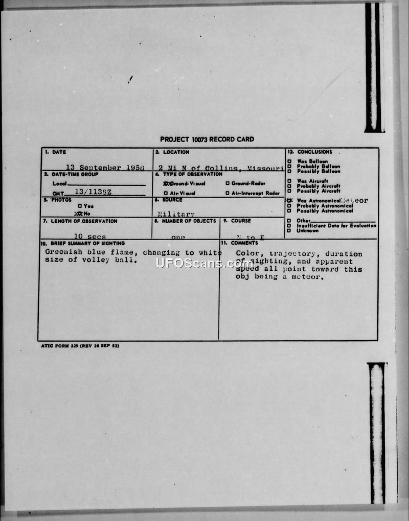 Project 10073 Record Card: Sighting near Collins, Missouri, 13 September 1958