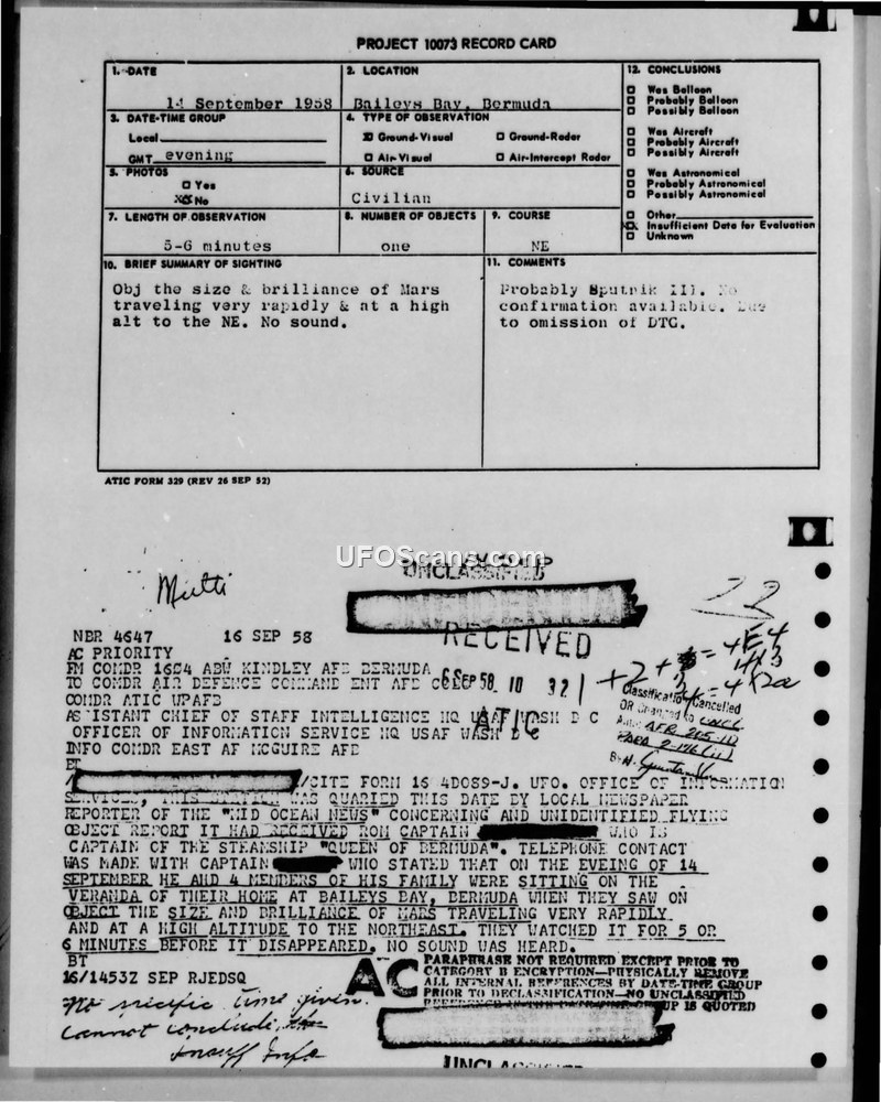 This document contains a collection of military records and correspondence regarding two separate Unidentified Aerial Phenomena (UAP) sightings reported on 14 September 1958. The first incident occurred in Baileys Bay, Bermuda, where the captain of the steamship 'Queen of Bermuda' and his family observed an object described as having the size and brilliance of Mars, traveling rapidly toward the northeast for approximately five to six minutes. This report was initially queried by a local newspaper, the 'Mid Ocean News'. The second incident involved radar returns at Wheelus Air Base in Libya. Military personnel, including Technical Sergeant Paul A. La Londe and Captains Thomas A. Walter and Robert J. Stewart, reported that an object was tracked by GCA and GCI radar systems. The object, which varied in altitude between 200 and 1000 feet and moved at speeds between 25 and 80 knots, was not visually confirmed despite attempts by an F-86 pilot. A subsequent evaluation by Colonel Gordon C. Hoffman of AFCIN-4E1 concluded that the information provided for both incidents was insufficient. He suggested that weather phenomena or equipment malfunctions were the most likely explanations for the radar returns and visual reports. The documents include record cards, staff messages, and a disposition form, all of which were eventually declassified.