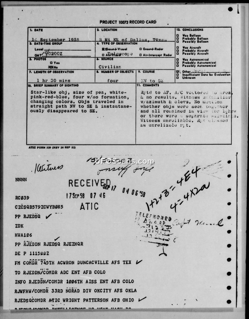 Project 10073 Record Card — 14 September 1958 Sighting, Dallas, Texas