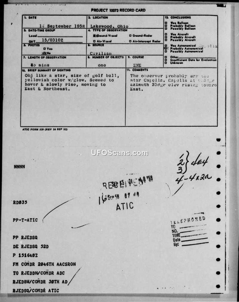 A 1958 sighting report from Lakewood, Ohio, describes a star-like object that was officially identified by ATIC as the star Capella.