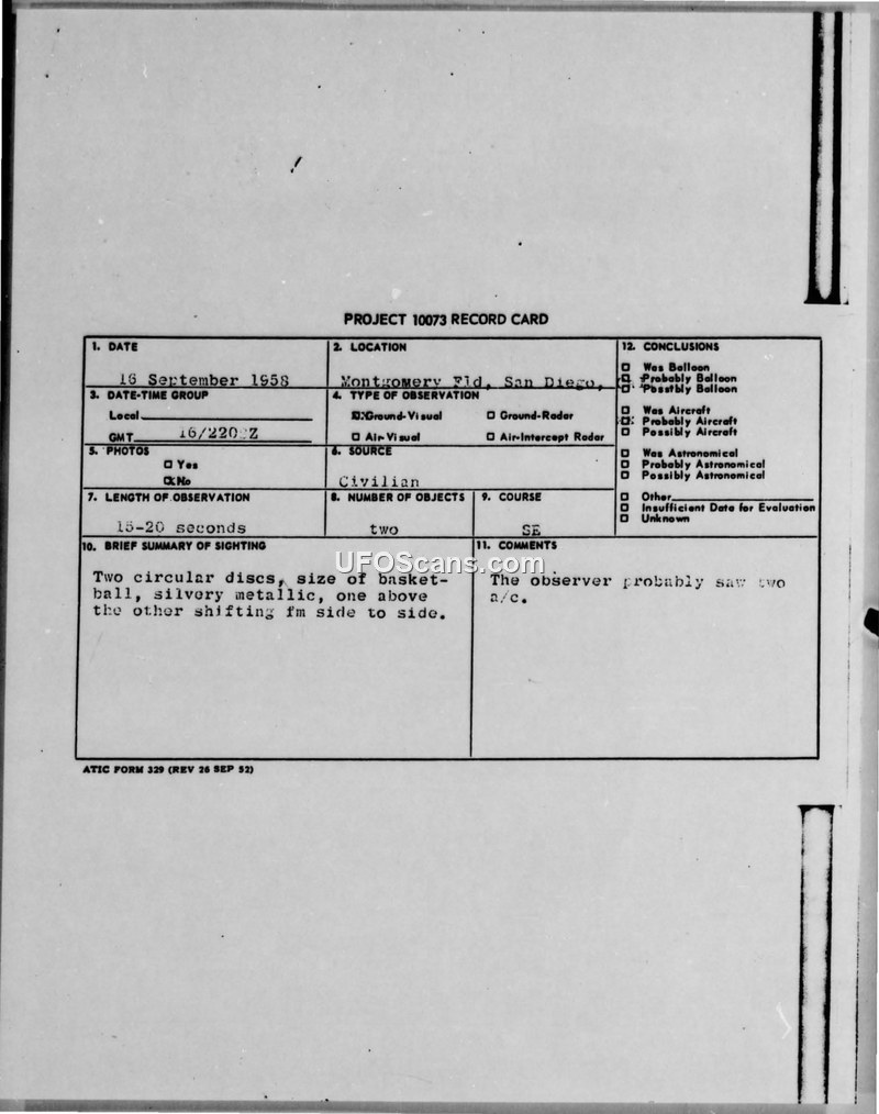 A civilian witness reported two metallic discs over San Diego in September 1958. Military investigators concluded the objects were likely aircraft, despite verifying local weather balloon activity.