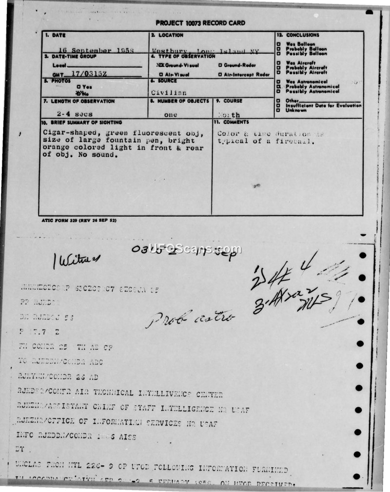 This document is a Project 10073 record card detailing a UFO sighting that occurred on September 16, 1958, in Westbury, Long Island, New York. The report describes a single, cigar-shaped object, approximately the size of a large fountain pen, which exhibited a green fluorescent color with bright orange lights at both the front and rear. The observation lasted between two and four seconds, and the object was reported to be moving in a northerly direction with no audible sound. The witness was described by investigators as an educated, intelligent, and reliable observer. The official conclusion reached by the Air Technical Intelligence Center was that the object was a fireball, noting that the color and duration of the event were typical for such a phenomenon. The report also references weather conditions, specifically a cold front with scattered thunderstorms located north of Mitchell Air Force Base, as a potential contributing factor. The document includes various administrative markings, including a teletype message header and weather plotting charts, which appear to be part of the broader investigative file for this incident. The investigation was conducted in accordance with Air Force Regulation 200-2.