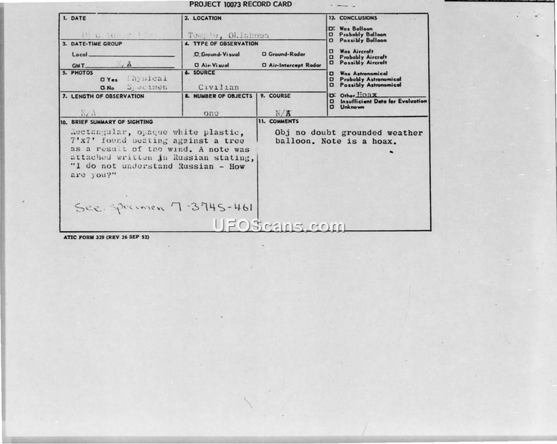 On 10 October 1958, an elderly couple in Temple, Oklahoma, discovered a rectangular, opaque white plastic object, measuring approximately 7 by 7 feet, caught in a tree on their property. The object was described as having its corners tied together with string in a parachute-like configuration. Attached to the string was a note written in Russian, which translated to 'I do not understand Russian - How are you?' The witnesses reported that the object was beating against the tree due to a brisk wind. They did not observe the object in flight but assumed it had arrived from the northeast. The witnesses eventually turned the plastic sheet and the note over to U.S. Army officials at Fort Sill, Oklahoma. The incident was investigated by the 3750th Air Police Squadron at Sheppard Air Force Base. Captain Martin S. Doria, the investigating officer, conducted a search of the area and found no unusual or clarifying data. The physical evidence was subsequently forwarded to the Air Technical Intelligence Center (ATIC) for analysis. ATIC analysts determined that the plastic sheet was a standard polyethylene balloon of the type used by weather stations. They concluded that the small size of the balloon precluded the possibility of it having crossed the Pacific Ocean on prevailing winds. Furthermore, intelligence officers determined that the Russian note was a prank, as the phrases were unrelated and appeared to have been copied from a standard foreign language phrase book issued to U.S. troops. The official conclusion of the Air Force was that the object was a grounded weather balloon and the attached note was a hoax.