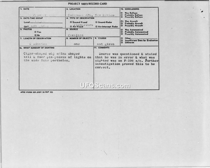 This document collection details the investigation of a UFO sighting reported on 10 October 1958 near Holloman Air Force Base, New Mexico. The initial report, filed under Project 10073, described a cigar-shaped object with a fan-shaped tail and four pin-point lights resembling portholes. The witness, identified in a press clipping as a missile engineer working for Telecomputing Corp. at the Air Force Missile Development Center (AFMDC), claimed to have observed the object through binoculars for approximately six minutes as it hovered above the horizon before vanishing over the San Andres Mountains. Following the report, the Air Technical Intelligence Center (ATIC) requested a formal investigation in accordance with Air Force Regulation 200-2, noting that such sightings often generated adverse publicity for the Air Force. AFMDC personnel subsequently interrogated the witness on 17 October 1958. During a follow-up interview on 20 October 1958, the witness recanted his initial report, stating that he had been in error. Further investigation by AFMDC concluded that the object was actually the sun's reflection on the contrails of an F-106 aircraft flying out of Holloman AFB. This conclusion was reportedly confirmed by a representative from the Air Phenomenon Research Organization in Alamogordo. The case was officially closed by AFMDC, with instructions that future inquiries regarding UFOs should be directed to Captain J. A. Woods.