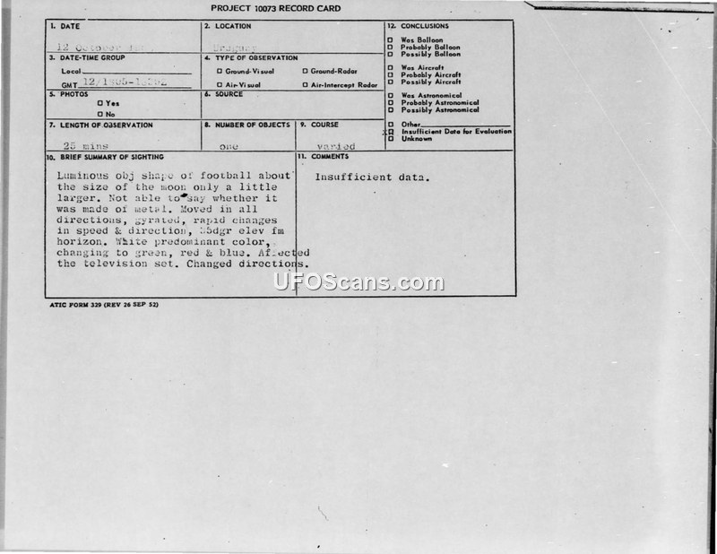 This document is a collection of records from the Uruguayan Centro de Investigacion de Objetos Voladores Inidentificados (CIOVI) regarding a sighting on October 15, 1958, in Sta. Lucia, Canelones. The primary witness, a 32-year-old judicial official, reported observing a luminous object at approximately 20:00 hours. The witness described the object as having an oval, metallic appearance, roughly the size of an orange at distance. It exhibited an oscillating movement, including ascents and descents, and was surrounded by red, blue, and green lights that moved rhythmically around a central yellowish-white light. The witness also noted a horizontal, smoke-like trail extending from one end of the object. The object moved in a straight line before changing directions and eventually disappearing. The witness explicitly stated that the object made no sound and that she did not experience any physical or electromagnetic effects. The CIOVI evaluation, dated October 13, 1958 (noting the discrepancy in dates between the report and the evaluation), considers the witness account complete and reliable. The investigators concluded that the sighting was undoubtedly a 'flying saucer' (disco volador), noting that the characteristics—specifically the shape, movement, and colored lights—were consistent with other cases in their files. They specifically highlighted the horizontal smoke-like trail as a unique feature for which they had no previous record. The document also includes a secondary, less detailed report of a similar sighting, and a list of coordinates and times, possibly related to other observations or tracking data. The overall tone of the document is one of serious investigation, with the CIOVI acting as a formal body under the auspices of the Uruguayan Air Force Intelligence Service.