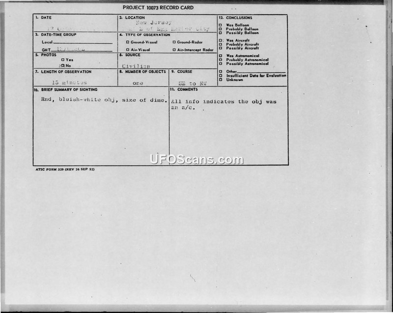 A civilian reported a round, bluish-white object near Egg Harbor City, NJ, in October 1958. Military authorities investigated the sighting and concluded it was likely an aircraft.
